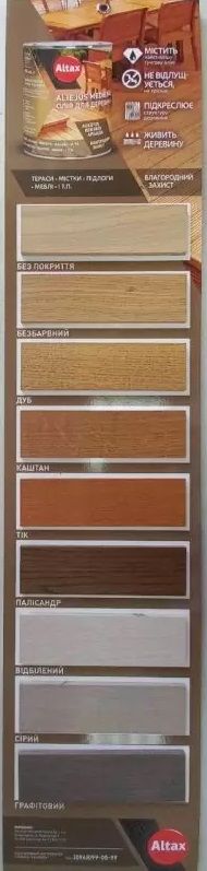 • декорує і забарвлює деревину, зберігаючи її малюнок; дозволяє деревині дихати;