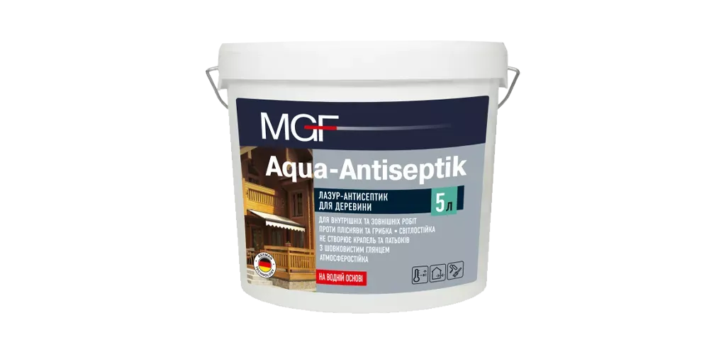 MGF Aqua-Antiseptik Лазур-антисептик для дерева - це матеріал на водній основі, розроблений для декоративного оздоблення та тривалого захисту поверхонь будь-яких порід деревини. Він ідеально підходить для обробки дерев'яних фасадів будинків, зрубів, парканів, дверей, віконних рам і інших дерев'яних конструкцій, таких як фанера, ДСП і ДВП. Варто зауважити, що не рекомендується використовувати його для покриття дощатих підлог.