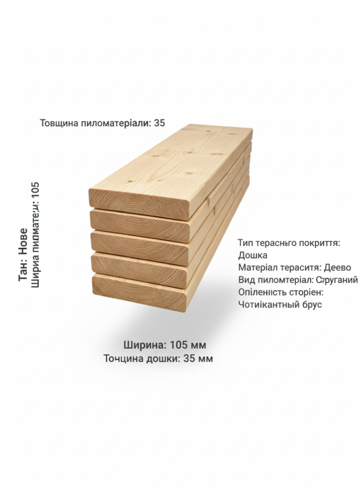 Дошка для тераси 105мм на 35мм - це ідеальне рішення для ваших терас. Вона відмінно підходить для створення затишного місця на відкритому повітрі, де ви зможете відпочивати та насолоджуватися природою.